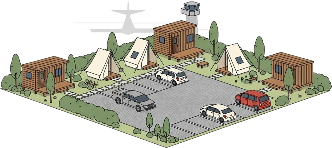 お車の入出庫はすべてお客様ご自身で行っていただき、スタッフが車に乗ることは一切ありません。鍵もお預かりしないため、大切なお車を安心してお預けいただけます。場内には無料のセルフ洗車機や掃除機を完備。出発前にご自身で愛車をきれいにできるので、旅の前後も気持ちよくお使いいただけます。また、空港までの送迎は1組から対応可能なプライベート送迎。お客様のタイミングに合わせて、すぐに出発できるのも大きな魅力です。